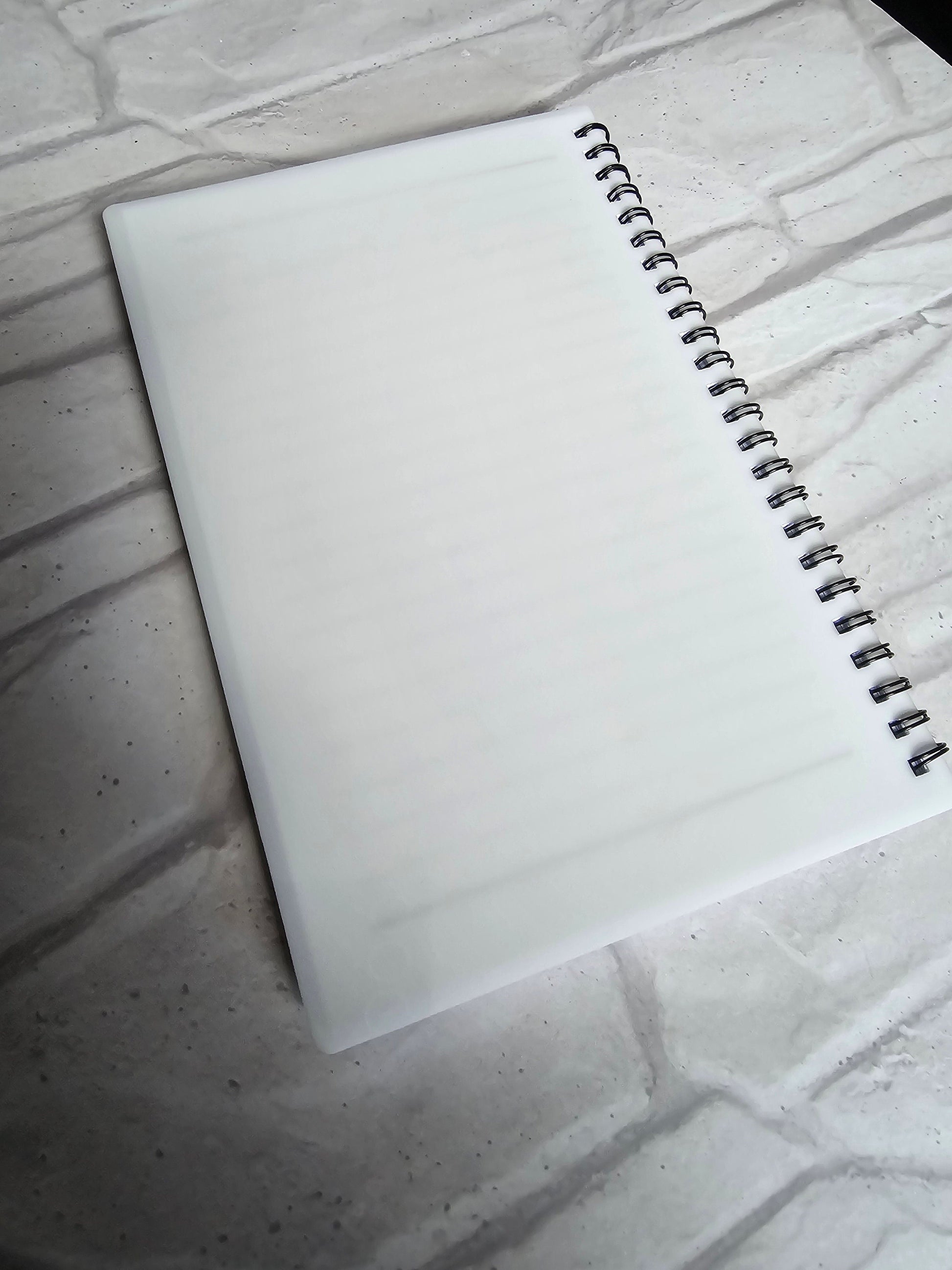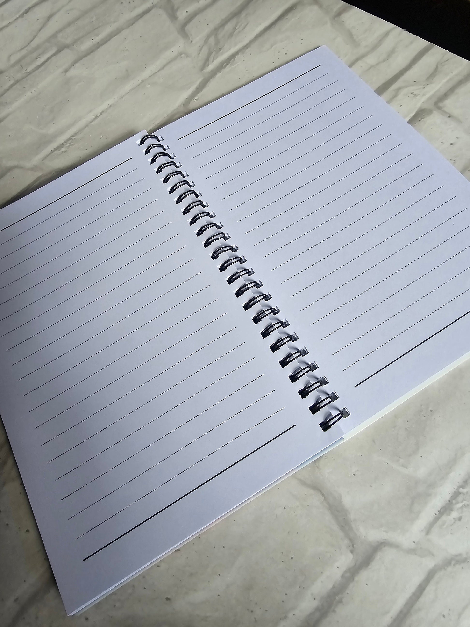 The book is A5 in size with 60 writeable pages. The book is wire bound with plastic front and back covers