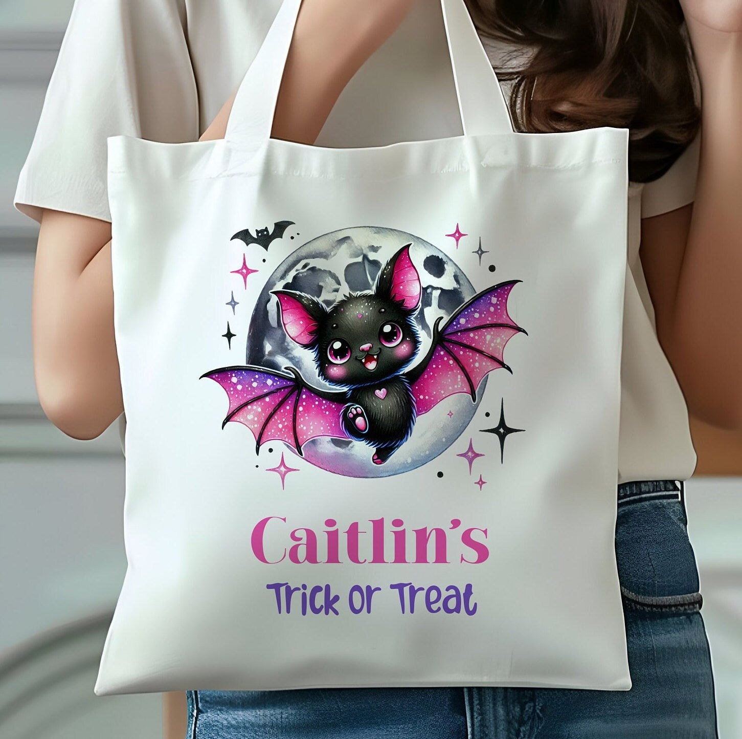 A super cute little Trick or Treat Personalised Bat tote bag perfect to add to any costume on halloween,